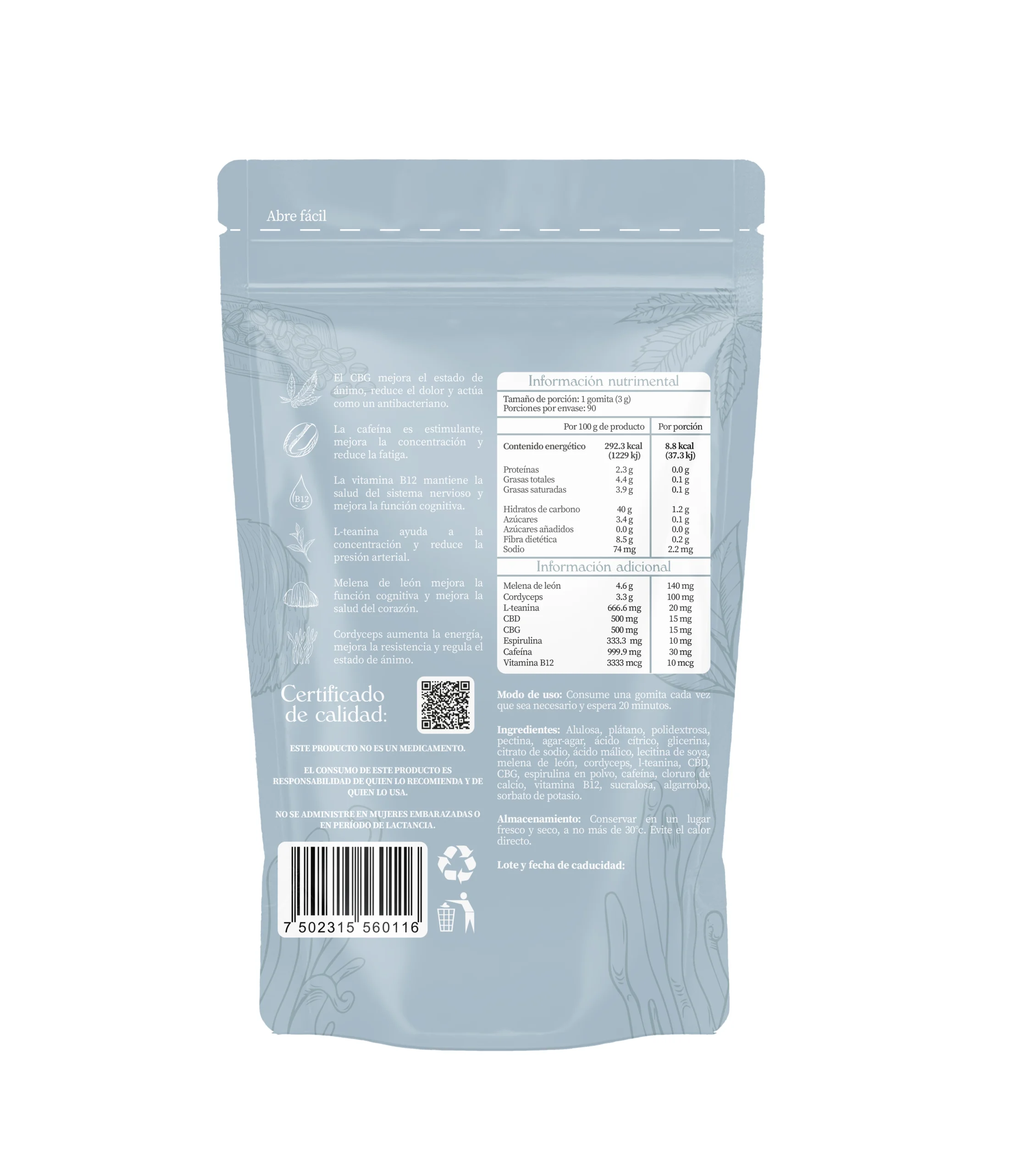 En cambio, las gomitas “Energía Mental” se diferencian por su fórmula avanzada, ya que combina cannabinoides (CBD y CBG) y adaptógenos, como Melena de León, con ingredientes energizantes: Cafeína y Vitamina B12.
