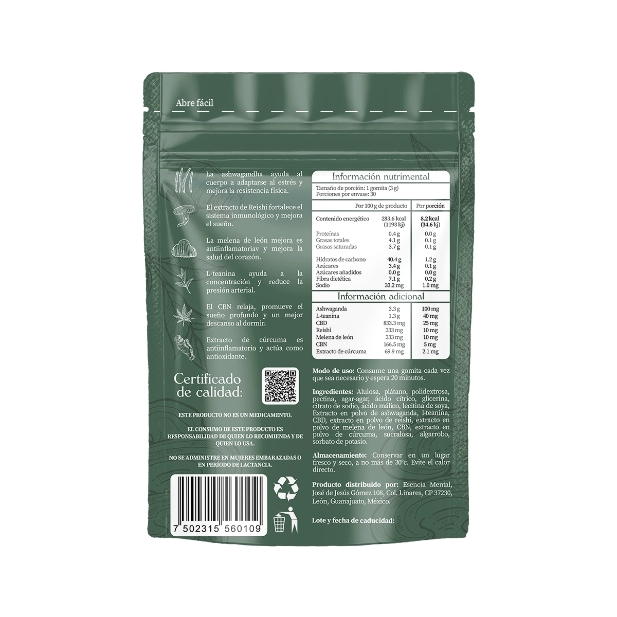 Las gomitas “Calma Plena” ofrecen un apoyo dual. Su CBD, CBN y L-teanina dan un alivio inmediato más potente al estrés, mientras que los adaptógenos como la Ashwagandha, Reishi y Melenea de león trabajan a mediano plazo para ayudar a tu cuerpo a gestionar el estrés de forma más eficaz en el momento y a largo plazo.