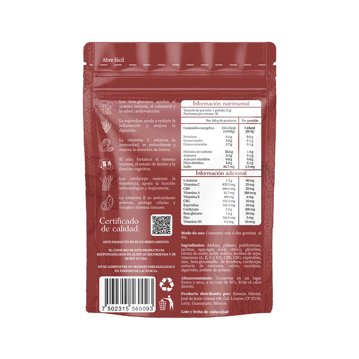 Su fórmula incluye Vitamina C, Zinc, Cordyceps, Beta-glucanos y Espirulina, junto a las vitaminas A, E y D3. Esta mezcla está diseñada para fortalecer tus defensas, ofreciendo una solución completa para mantenerte protegido.